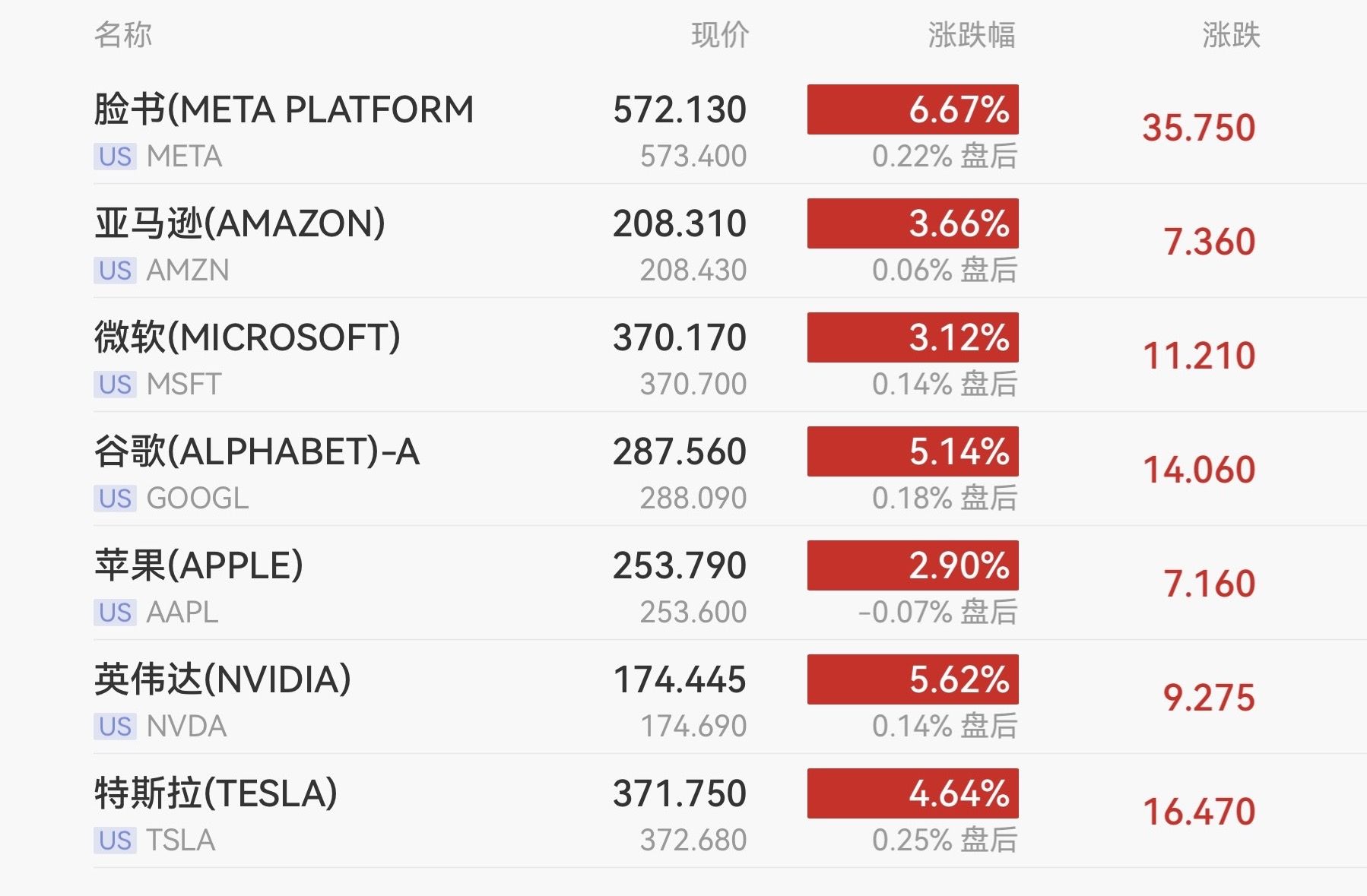 明星科技股全线走强,Meta收涨6.67%,英伟达涨5.62% ,谷歌涨5.14%,特斯拉涨4.64%,亚马逊涨3.66% ,微软涨3.12%,苹果涨2.90% 。