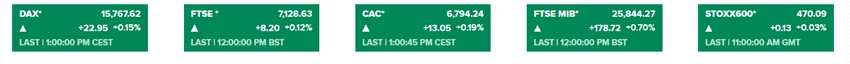 伦敦股市开盘时富时100指数持平,巴黎股市CAC 40指数下跌0.1% ,法兰克福股市德国DAX指数上涨0.1% 。截至发稿,欧洲股市主要股指走势如图所示: