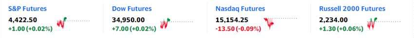 美股期货方面:目前来看,美股期货走势震荡,欧市早盘标准普尔500指数期货和道琼斯指数期货持平 ,纳斯达克指数期货下跌0.1%。截止发稿,美股期货走势如图所示: