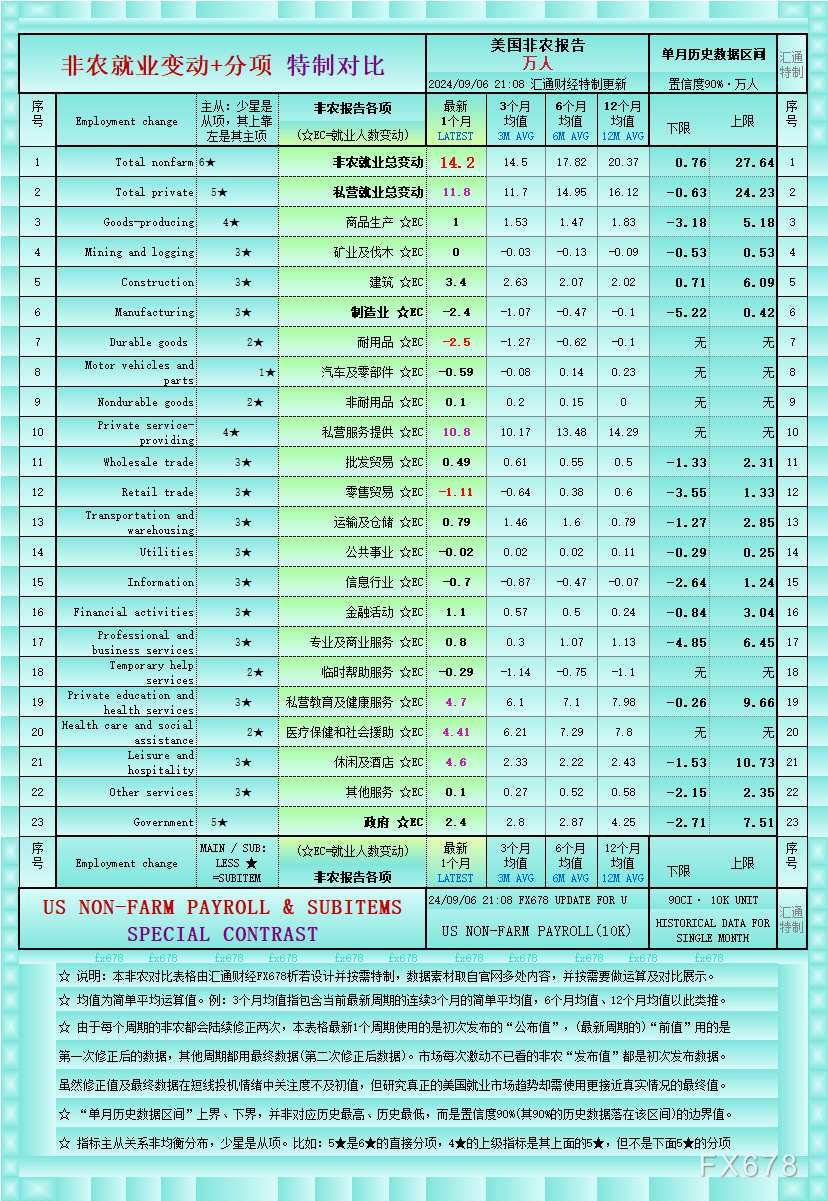 研究非农“细分项”的看过来,一张图详解非农及各行业分项。一张图:美国非农就业+各行业分项就业变动一览,包括最新值、3个月均值、6个月均值 、12个月均值、各项就业指标历史数据置信度90%的区间(指月度历史数据有90%的历史数据落在该区间内)。如下汇通财经特制图表显示 ,美国8月非农仅增加14.2万,受到制造业、耐用品 、零售贸易三个行业就业形势负增长加剧的拖累,就业领先的有:私营服务、私营教育及健康服务、医疗保健和社会援助 、休闲及酒店(但这四个的中间两个最新一个月表现较三个月均值仍显示就业增速放缓) 。其他行业的就业形势表现处于这些的之间。